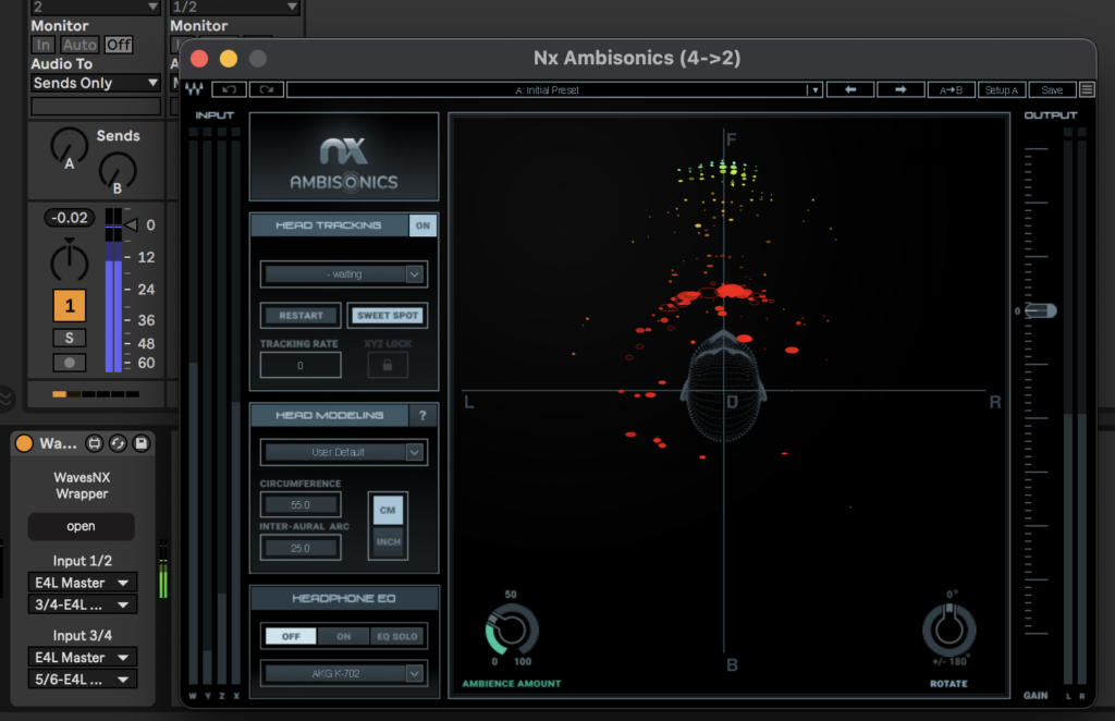 The device loads the Waves “NX ambisonics (4->2)” audio unit into the max patch. Choose the audio track that contains the Envelop Master Bus and select channel 3/4 for input 1/2 and 5/6 for input 3/4.