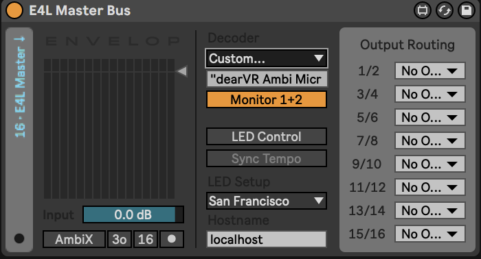 As an alternative you can also download a decoder maxpatch to use with the Envelope E4L Masterbus. This loads the dearVR Ambi Micro Plugin in the background using the TOA (16Ch) input and decodes with Binaural dear VR codec. Unfortunately there is no way to trigger the plugin gui.